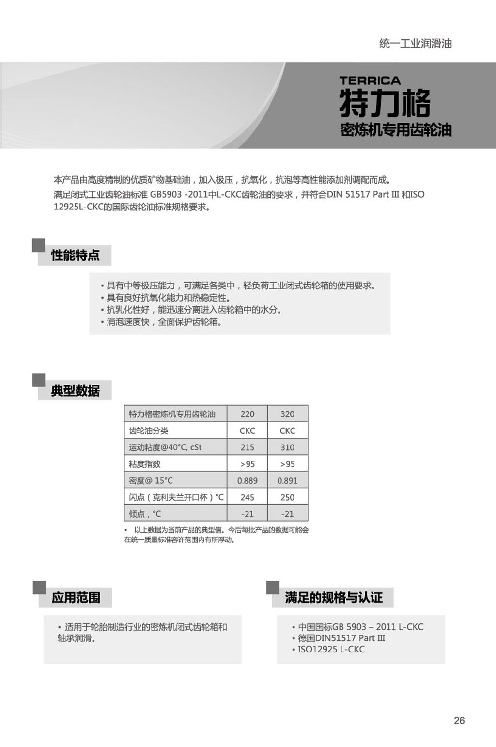 產(chǎn)品名稱:特力格密煉機(jī)專用齒輪油 SAE粘度: 220#、 320# 包裝規(guī)格:170kg 滿足規(guī)格:滿足閉式工業(yè)齒輪油標(biāo)準(zhǔn) GB5903 -2011中L-CKC齒輪油的要求,并符合DIN 51517 Part III 和ISO 12925L-CKC標(biāo)準(zhǔn)規(guī)格