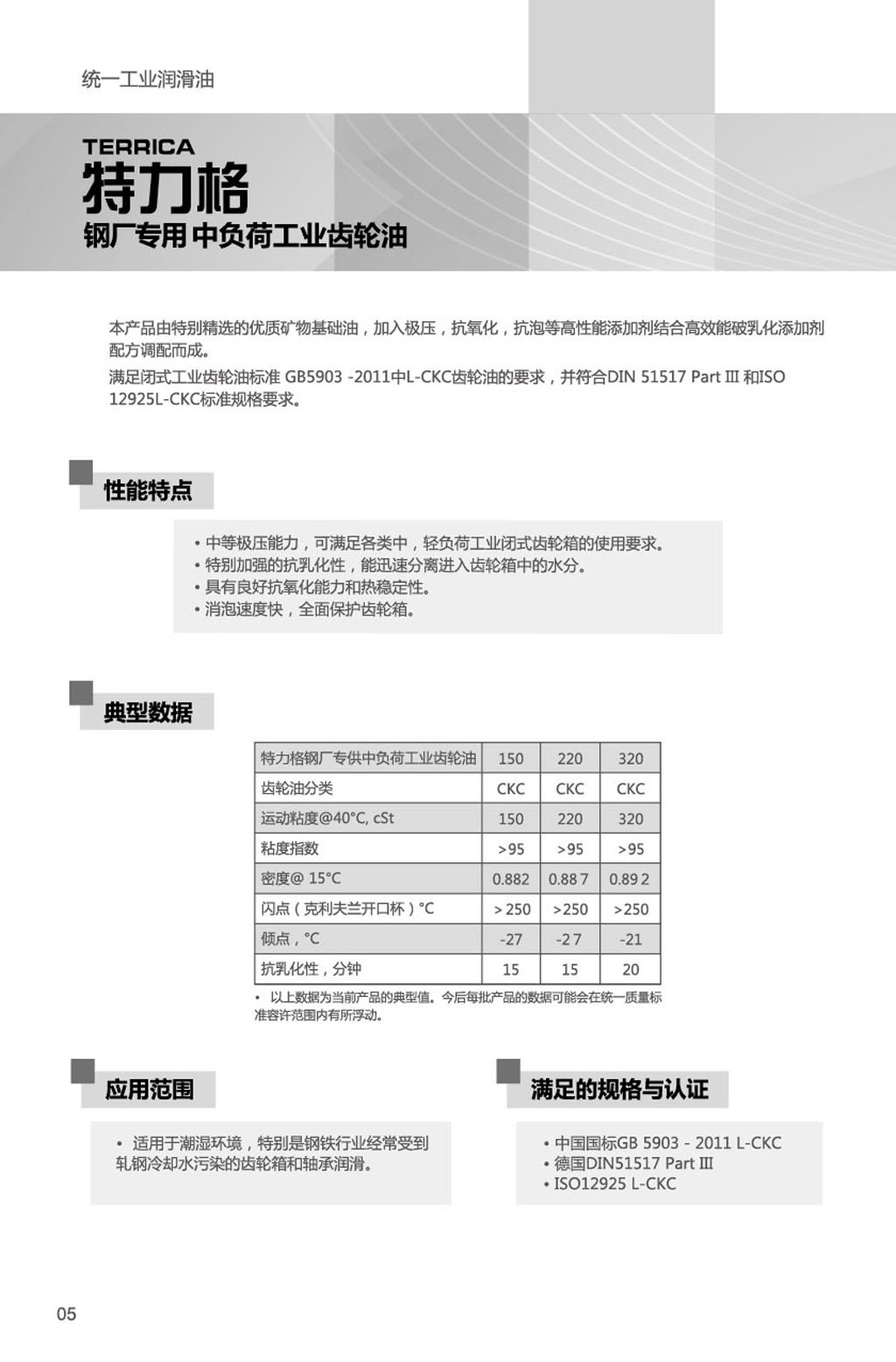 滿足規(guī)格:滿足閉式工業(yè)齒輪油標(biāo)準(zhǔn) GB5903 -2011中L-CKC齒輪油的要求,并符合DIN 51517 Part III 和ISO 12925L-CKC標(biāo)準(zhǔn)規(guī)格要求。