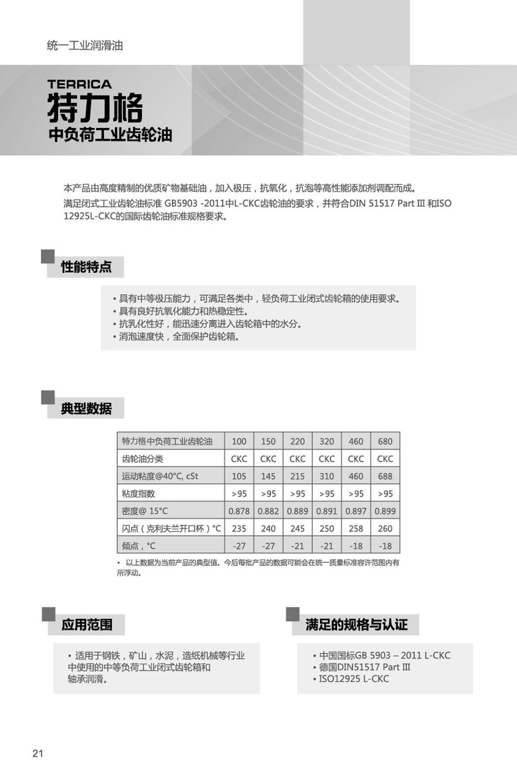 滿足規(guī)格:滿足閉式工業(yè)齒輪油標(biāo)準(zhǔn) GB5903 -2011中L-CKC齒輪油的要求,并符合DIN 51517 Part III 和ISO 12925L-CKC標(biāo)準(zhǔn)規(guī)格要求。