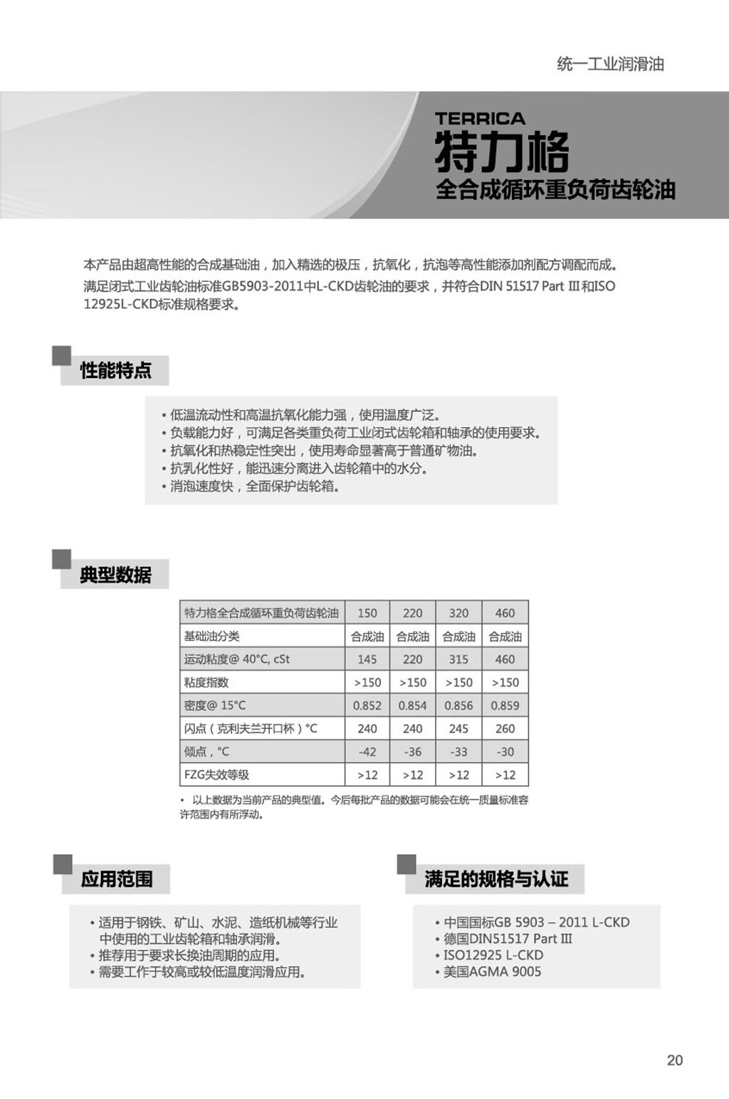 滿足規(guī)格:滿足閉式工業(yè)齒輪油標(biāo)準(zhǔn) GB5903 -2011中L-CKD齒輪油的要求,并符合DIN 51517 Part III 和ISO 12925L-CKD標(biāo)準(zhǔn)規(guī)格要求。