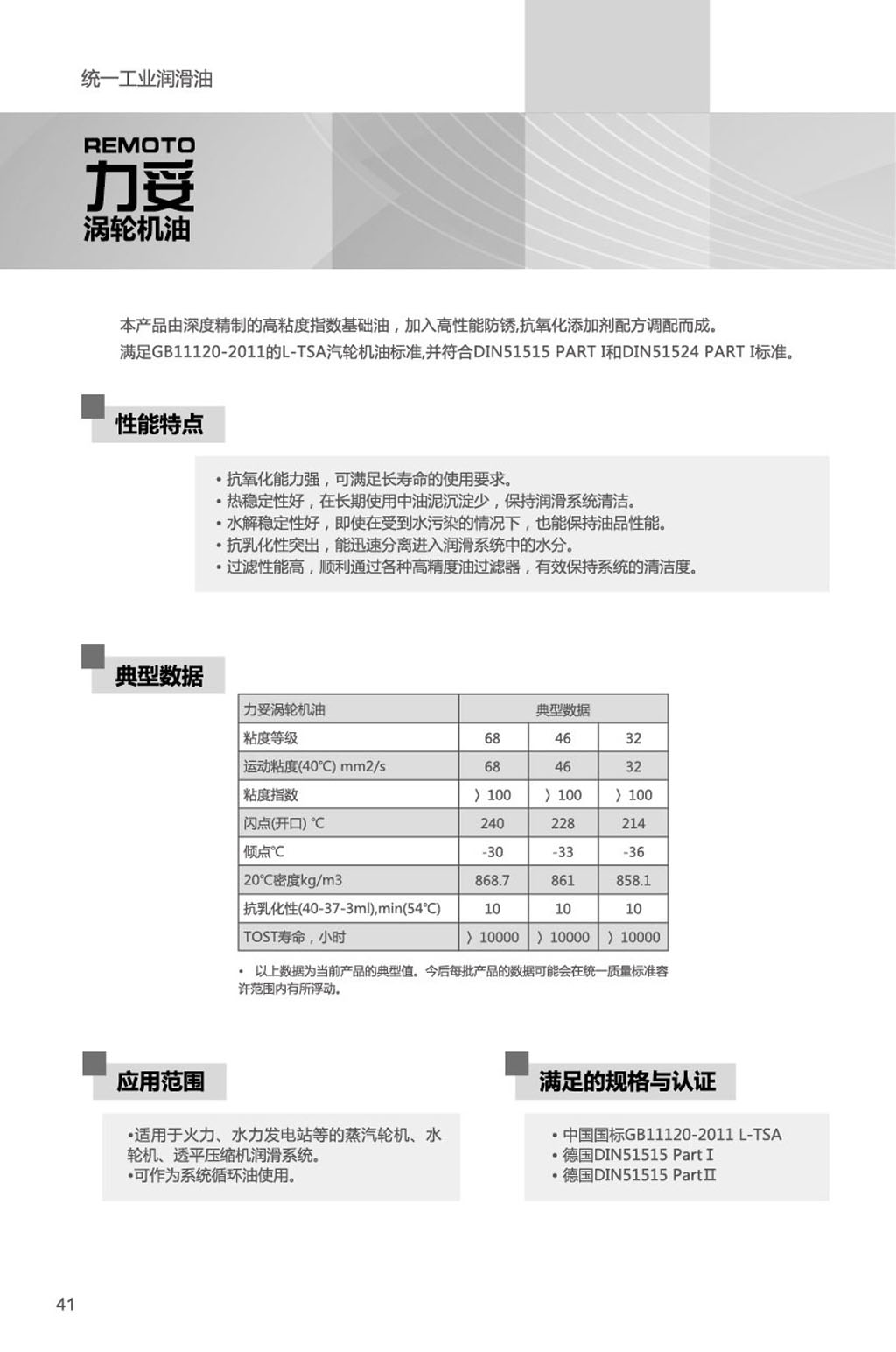 滿足規(guī)格:滿足GB11120-2011 的L-TSA渦輪機油標準,并符合DIN 51515 Part I和 DIN51524 Part I標準。